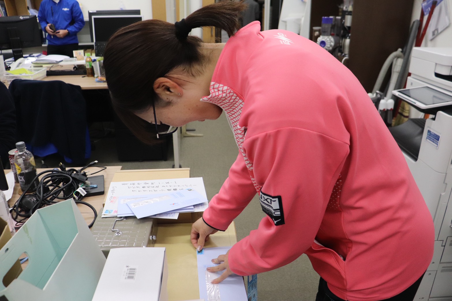 会社、寮の光熱費等の精算、備品等の管理、電話対応、郵送物の発送・仕分け、その他事務作業を行っています。